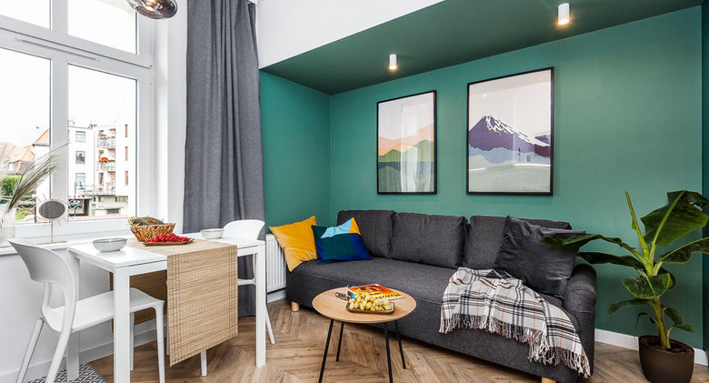 W gdańskiej kawalerce dominuje zieleń oraz biel. Nietypowa wnęka powstała poprzez wykorzystanie konstrukcyjnej wady lokalu i podkreślenie jej mocnym kolorem. Jest to zabudowa wysokiego podciągu będącego wzmocnieniem drewnianej konstrukcji stropów. Dzięki zastosowanym rozwiązaniom mieszkanie jest przytulne i przestrzenne mimo swojego niewielkiego metrażu - 17 metrów kwadratowych.